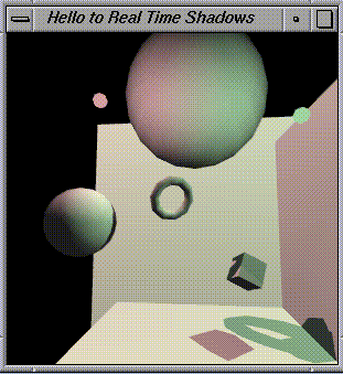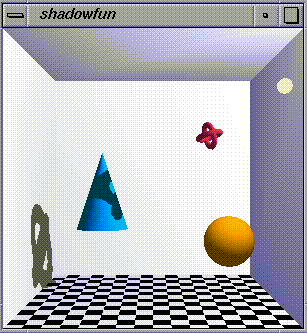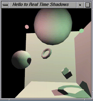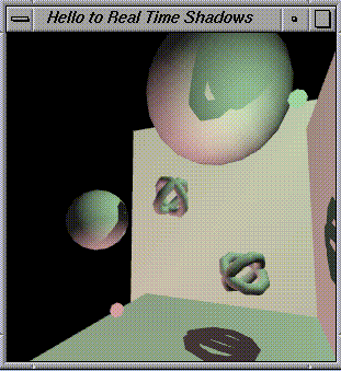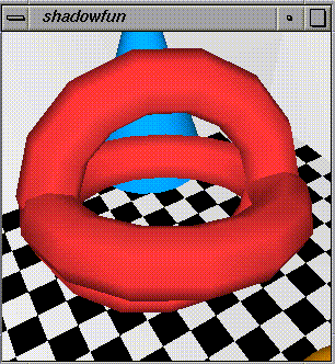The source code and screen snapshots below demonstrate real-time shadows cast by object of arbitary shape onto arbitary geometry. The shadows are not the simple "planar shadow projections" so common in games and 3D graphics demos today. These shadows can be cast onto curved surfaces and can even be cast by objects with holes in them. The programs shown run at more than 15 frames per second on my SGI workstation. It could go faster with further tuning.